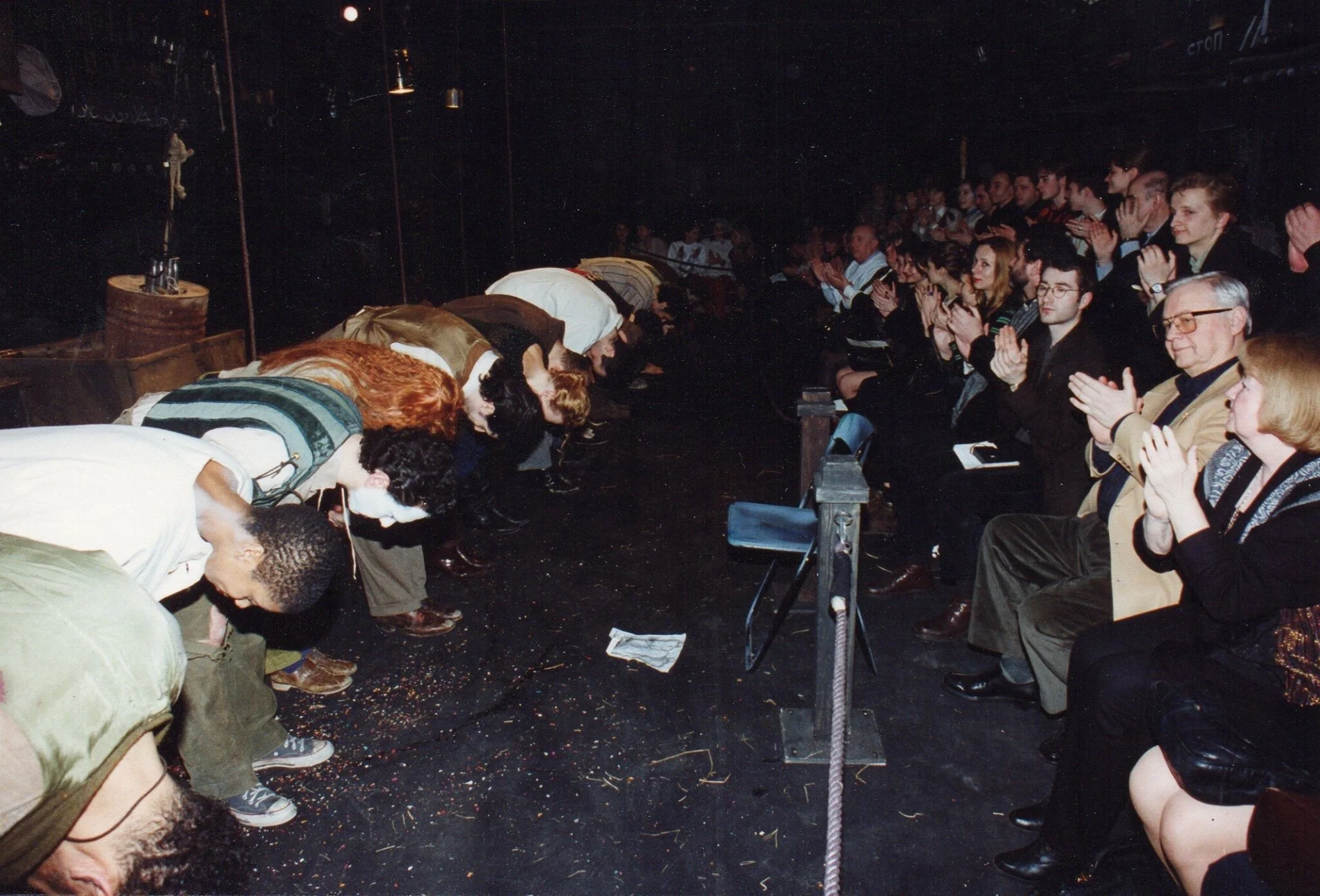 "The author's original title, later changed by (Moscow Art Theater co-founder) Nemirovich-Danchenko, despite the differences in this production, is still clearly expressed through the scenography. Shelter is an "out stage" show, as (famed Russian director) Meyerhold put it. Scarce properties come down from above: a barrel filled with light - sometimes blue, sometimes yellow - creates a sense of the bottom, some kind of miraculous aquarium. The barrel's light brings the feel of close-ups to the show, giving it a cinematic quality. The action is dynamic, and evolving - and, like with films, has no pauses between scenes. Fate doesn't spare anybody - neither the pure-souled actor (Peter Tedeschi) nor caustic intellectual Satin (Jay O’Berski), neither explosive Ash (Carlos Orizondo), nor Bessy-Vasilisa (Liisa Yonker), neither unsinkable Red (Chloe Keller), nor young Mute (Nicole Ricciardi). However the show doesn't fill you with a sense of aggravation. It is actually cheerful - it is alive, sparkling in many senses because of the Americanized concept of the play, which refuses to allow fruitless wordiness and depression.